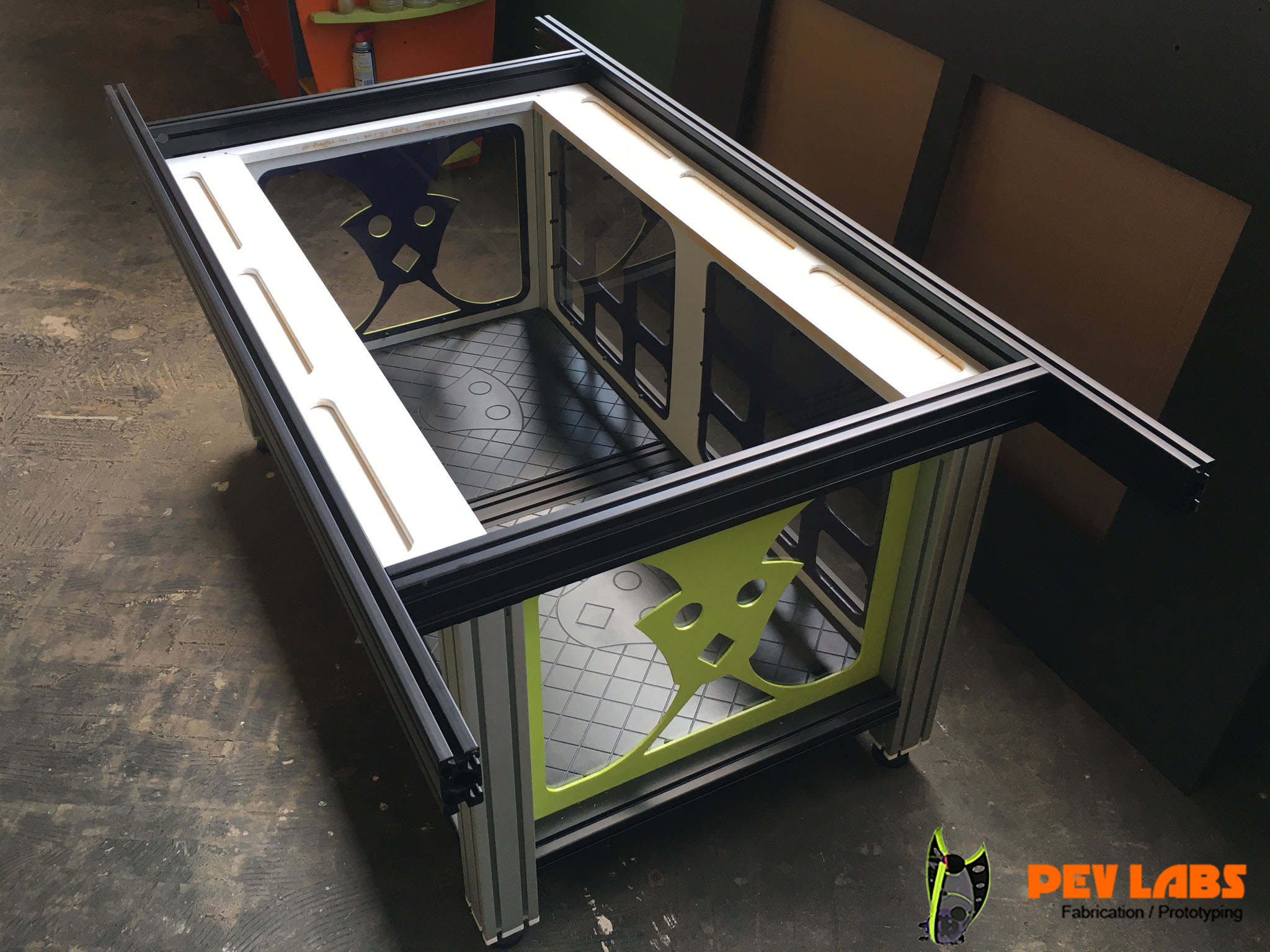 We have begun design and construction of our high powered 90 Watt CO2 laser cutter and engraver build. Building custom machinery with the specific needs of our shop and client base is a passion of ours. Here are a few pics of the design and progress. Designing, building and utilizing digital fabrication equipment is a way of life at PEV Labs. This high powered laser is designed to accommodate duel laser cutting gantries with two laser tubes. Laser base cabinet is complete. Currently working on laser chassis framing by adding mechanicals to support the auto focus Z-bed. Send us a drawing if you would like to get a quick quote on Laser Engraving.