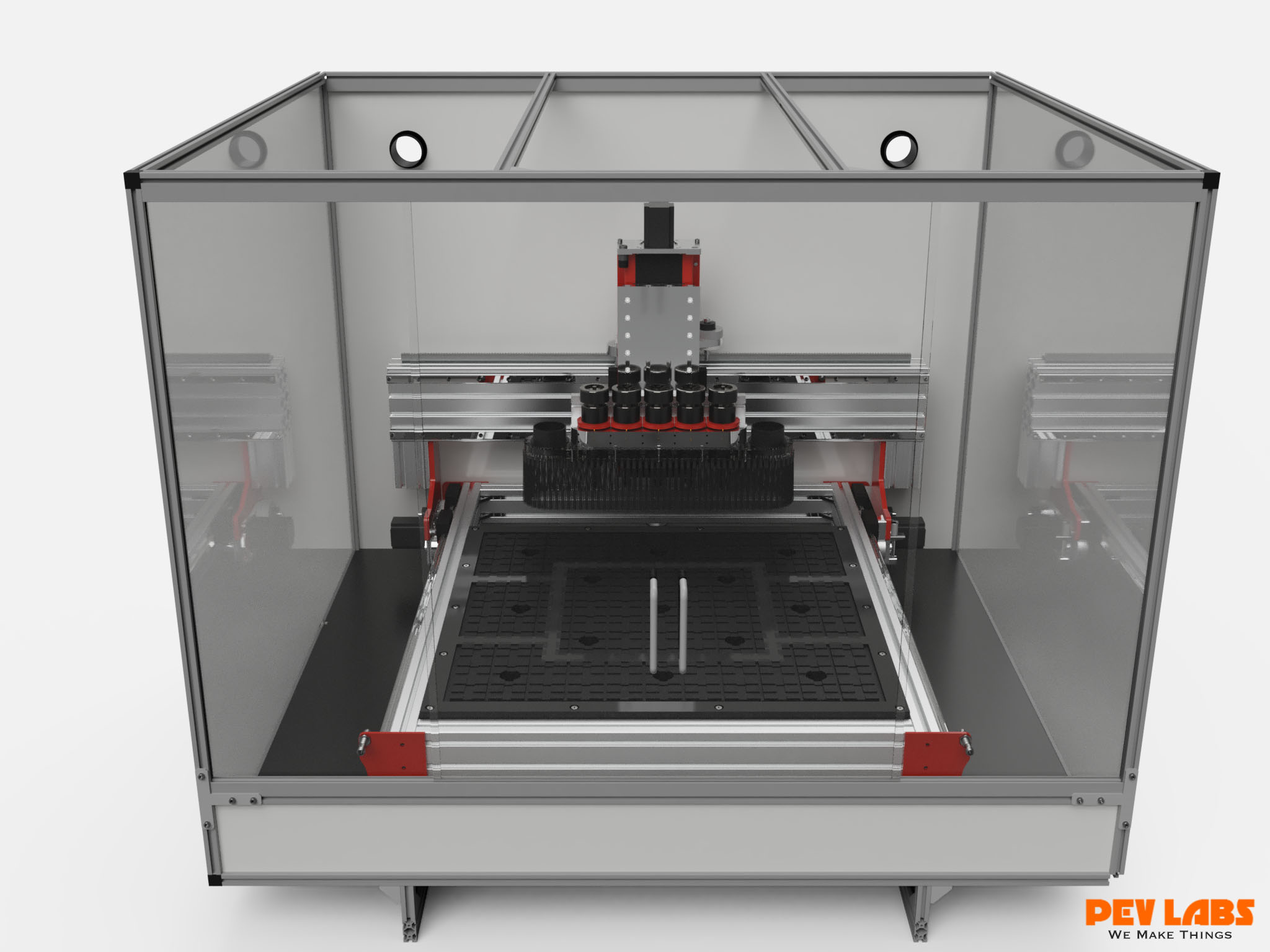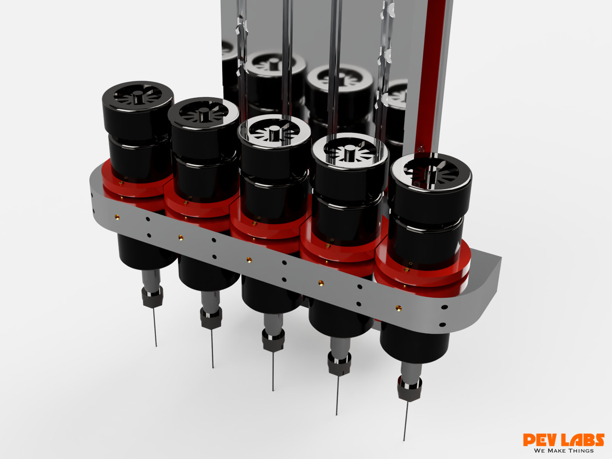 Custom designed multi-spindle CNC Machine with vacuum table. This particular model is a small format and deploys up to five small spindles. The intent of this machine is to produce five sets of fairly tiny parts simultaneously. The custom milled spindle mount has micro Z-depth adjuster rings along with front set screws to lock the spindle heights once adjusted. A custom multi-spindle dust boot to accommodate the many spindles. One could optionally use three spindles in stead of five. Pictured are 52mm air cooled hobby spindles. ER11 collets accept 1/8 end mills. Units run from 3,000 up to 12,000rpm on 24-100 volts DC. Spindle run out 0.01-0.03. We use our DIY large format CNC machine daily as it is the core of our CNC milling service offerings. CNC machining for your personal or business manufacturing needs. Visit our 90 watt DIY CO2 laser cutter engraver project build currently in progress.